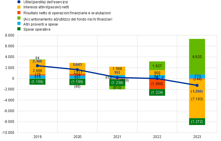 La perdita della BCE per il 2023, in seguito all’utilizzo dell’intero ammontare del fondo rischi finanziari, è pari a 1.266 milioni di euro (zero nel 2022). Per decisione del Consiglio direttivo, tale perdita sarà portata a nuovo nello stato patrimoniale della BCE e coperta con gli utili degli esercizi successivi.