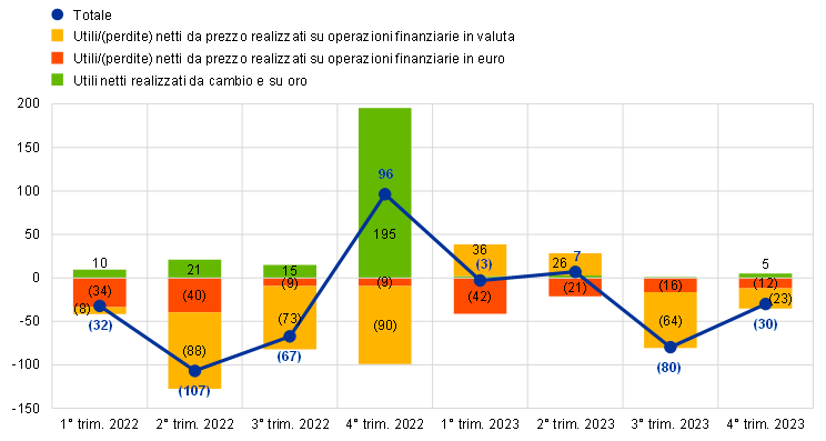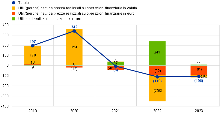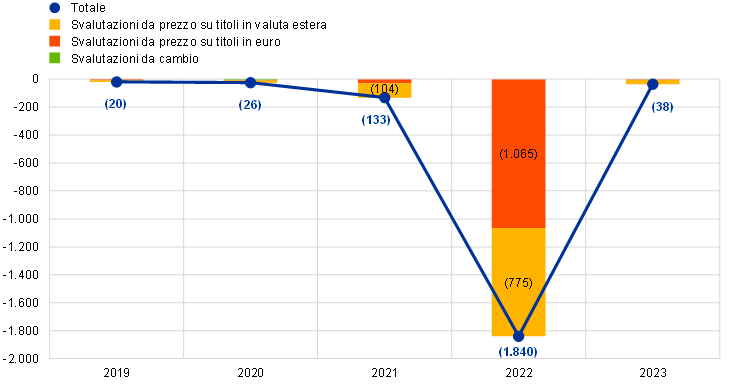 Nel 2023 il controvalore totale in euro delle riserve in valuta della BCE, costituite da oro, diritti speciali di prelievo, dollari statunitensi, yen giapponesi e renminbi cinesi, è aumentato di 3,3 miliardi di euro raggiungendo 87,7 miliardi.