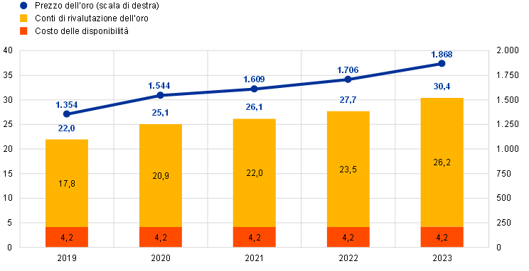 Il controvalore in euro delle disponibilità e dei crediti in oro della BCE, pari a 30,4 miliardi di euro a fine 2023 (grafico 4), mostra un incremento di 2,7 miliardi di euro dovuto principalmente al rialzo del prezzo di mercato dell’oro espresso in euro. Tale incremento ha determinato anche un corrispondente aumento dei conti di rivalutazione dell’oro della BCE (cfr. la sezione 1.3.2 “Patrimonio netto”). Inoltre, a seguito dell’adozione della moneta unica da parte della Croazia con effetto dal 1° gennaio 2023, la Hrvatska narodna banka ha trasferito alla BCE oro per un controvalore di 96 milioni di euro.