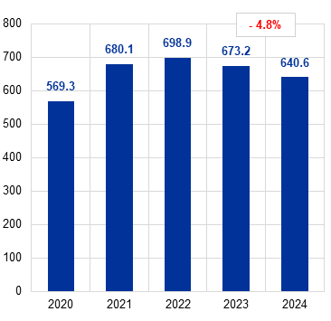 Tháinig laghdú €56.4 billiún go dtí €388.7 billiún in 2024 ar dhliteanais BCE laistigh den Eurochóras, arb é atá iontu den chuid is mó glan‑iarmhéid TARGET de BCNanna sa limistéar euro vis‑à‑vis BCE agus dliteanais BCE maidir leis na sócmhainní cúlchistí eachtracha a d’aistrigh BCNanna sa limistéar euro chuige nuair a chuaigh siad isteach san Eurochóras.
