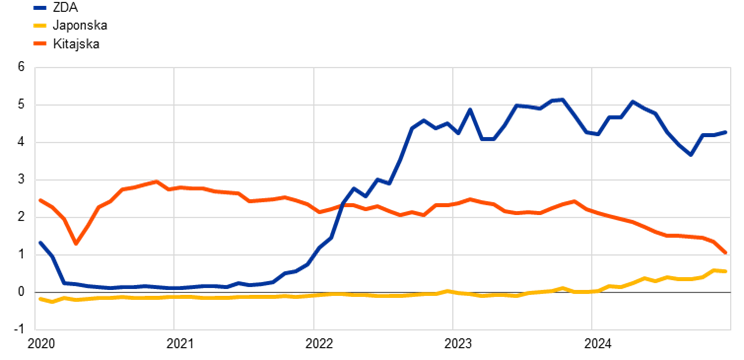 Na podlagi sklepov Sveta ECB je Eurosistem z julijem 2023 prenehal ponovno investirati glavnico zapadlih vrednostnih papirjev v okviru programa APP. Eurosistem je v prvi polovici leta 2024 še naprej v celoti ponovno investiral glavnico zapadlih vrednostnih papirjev v okviru programa PEPP, v drugi polovici leta pa le deloma, tako da se je v tem obdobju portfelj v okviru programa PEPP na ravni Eurosistema v povprečju zmanjšal za 7,5 milijarde EUR na mesec. Ob koncu leta 2024 se je ponovno investiranje v okviru programa PEPP zaključilo. Zaradi teh sklepov se je portfelj vrednostnih papirjev, ki jih ima ECB za namene denarne politike, zmanjšal za 48,6 milijarde EUR na 376,8 milijarde EUR (graf 2). Program APP se je zmanjšal za 41,6 milijarde EUR na 220,1 milijarde EUR, pri čemer so se imetja v okviru programov PSPP, ABSPP in CBPP3, ki sestavljajo program APP, zmanjšala za 32,2 milijarde EUR, 6,3 milijarde EUR oziroma 3,1 milijarde EUR. Portfelj v okviru programa PEPP se je zmanjšal za 6,8 milijarde EUR na 156,3 milijarde EUR.