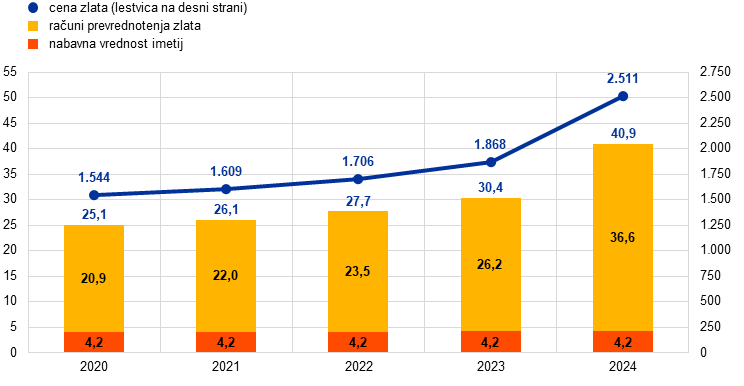 Eurska protivrednost zlata v imetju ECB se je leta 2024 povečala za 10,5 milijarde EUR na 40,9 milijarde EUR (graf 4), in sicer predvsem zaradi zvišanja tržne cene zlata, izražene v eurih. To povečanje je privedlo tudi do enakovrednega zvišanja vrednosti računov prevrednotenja zlata (glej razdelek 1.3.2 »Neto kapital«).