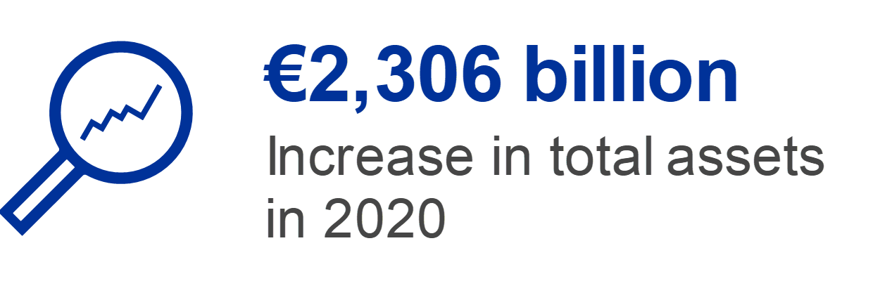 In 2020 the Eurosystem’s total assets increased by €2,306.2 billion to €6,977.7 billion (+49.4%), mainly because of an increase in Eurosystem refinancing operations, in particular due to allotments under the third series of targeted longer-term refinancing operations (TLTRO III), and purchases of securities under the asset purchase programme (APP)[1] and the new pandemic emergency purchase programme (PEPP)[2].