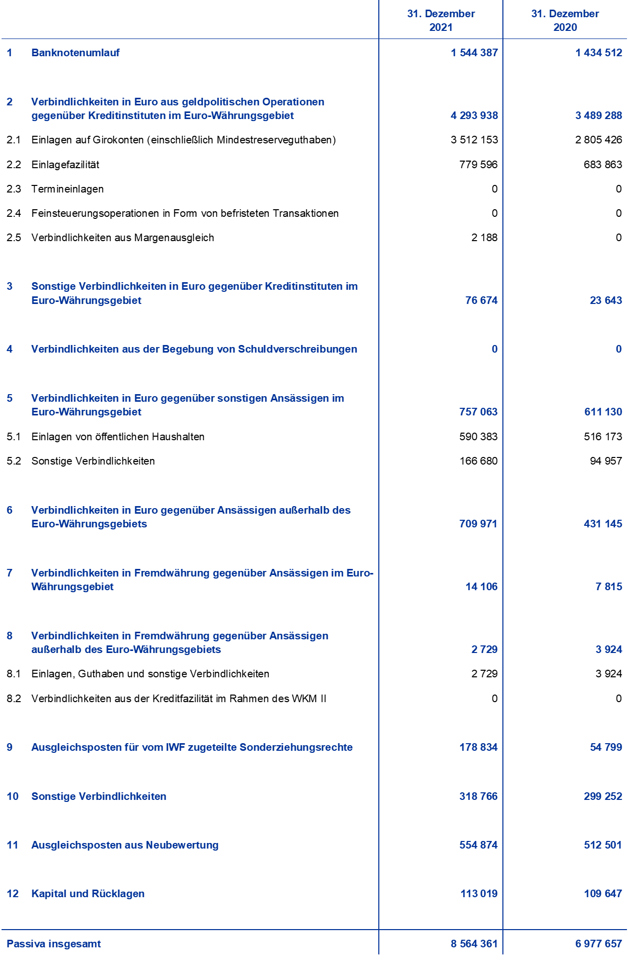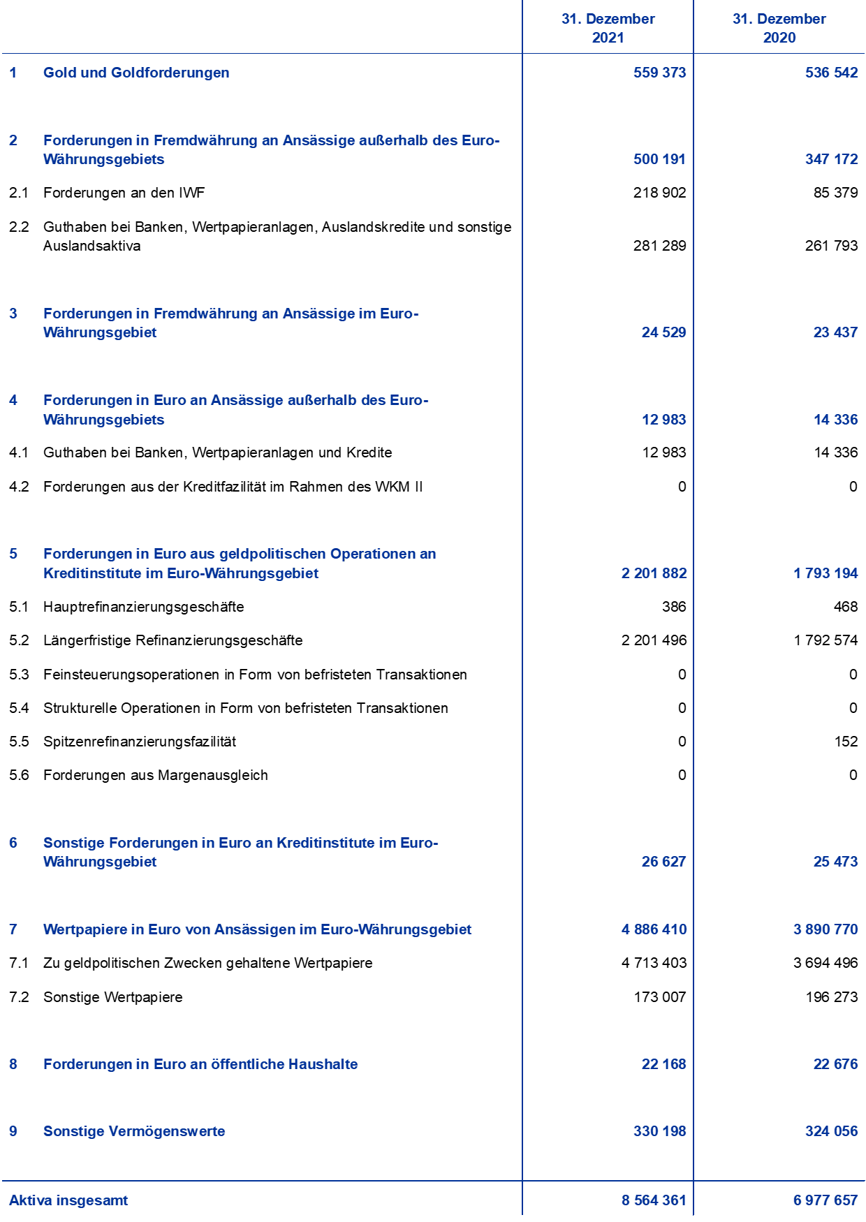Konsolidierte Bilanz des Eurosystems zum 31. Dezember 2021