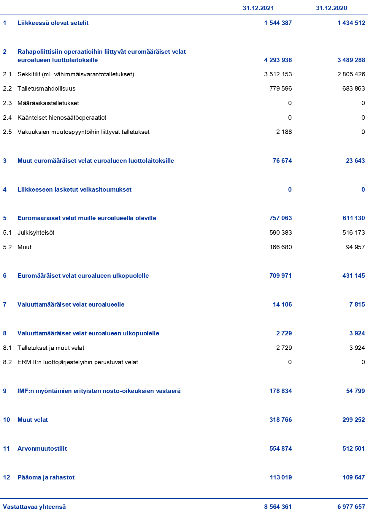 Eurojärjestelmän konsolidoitu tase 31.12.2021