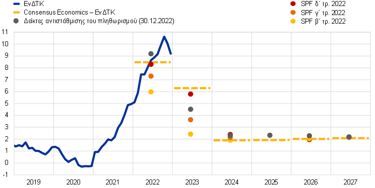 Πηγές: Μακροοικονομικές προβολές των εμπειρογνωμόνων του Ευρωσυστήματος για τη ζώνη του ευρώ, Δεκέμβριος 2022, και υπολογισμοί της ΕΚΤ.