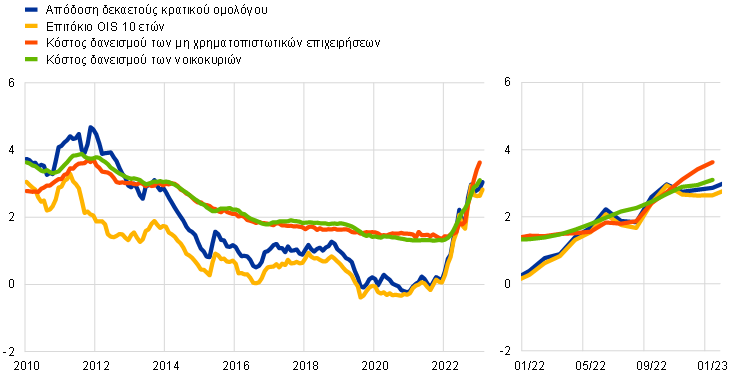 Έτσι, τον Δεκέμβριο, μετά την τελευταία συνεδρίαση νομισματικής πολιτικής του έτους, ανακοινώσαμε ότι τα επιτόκια θα πρέπει ακόμη να αυξηθούν σημαντικά με σταθερό ρυθμό προκειμένου να διαμορφωθούν σε επίπεδα που είναι επαρκώς περιοριστικά για να διασφαλιστεί η έγκαιρη επαναφορά του πληθωρισμού στον στόχο μας. Ταυτόχρονα, ανακοινώσαμε ότι, ενώ τα βασικά επιτόκια της ΕΚΤ είναι το πρωταρχικό εργαλείο μας μέσω του οποίου καθορίζουμε την κατεύθυνση της πολιτικής μας, από τον Μάρτιο του 2023 θα αρχίσουμε να συρρικνώνουμε το χαρτοφυλάκιο τίτλων του APP με μετρημένο και προβλέψιμο ρυθμό. Είχε προηγηθεί τον Οκτώβριο η απόφασή μας να τροποποιήσουμε τους όρους των πράξεων TLTRO III, εξαλείφοντας τα αντικίνητρα για την οικειοθελή πρόωρη αποπληρωμή τους. Τα στοιχεία ενεργητικού στον ισολογισμό μας που συνδέονται με τη νομισματική πολιτική μειώθηκαν κατά 830 δισεκ. ευρώ περίπου από το τέλος Ιουνίου (οπότε τερματίστηκαν οι καθαρές αγορές τίτλων) μέχρι το τέλος Δεκεμβρίου, συμβάλλοντας στην ομαλοποίηση του μεγέθους του ισολογισμού μας.