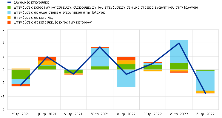 Ο ρυθμός μεταβολής των επενδύσεων εκτός των κατασκευών – προσεγγιστική μεταβλητή για τις ιδιωτικές επενδύσεις εκτός των κατοικιών – παρουσίασε έντονες διακυμάνσεις το 2022 (Διάγραμμα 1.5).[1] Αν εξαιρεθεί η ιδιαίτερα ευμετάβλητη συνιστώσα των επενδύσεων σε άυλα στοιχεία ενεργητικού στην Ιρλανδία,[2] ο ρυθμός αύξησης των επενδύσεων εκτός των κατασκευών επιβραδυνόταν καθ’ όλη τη διάρκεια του έτους. Στην αρχή του έτους ήταν δυναμικός, ωθούμενος από την υψηλή ζήτηση, την εύρωστη κερδοφορία των επιχειρήσεων και τις ευνοϊκές συνθήκες χρηματοδότησης με την άρση των περιορισμών λόγω της πανδημίας. Ωστόσο, ο ρωσοουκρανικός πόλεμος και η επακόλουθη ενεργειακή κρίση, σε συνδυασμό με τη μείωση των μέτρων τόνωσης της οικονομίας μέσω της νομισματικής πολιτικής, επέφεραν άνοδο του κόστους ενέργειας και χρηματοδότησης για τις επιχειρήσεις. Μαζί με την επιβράδυνση της εγχώριας και της παγκόσμιας ζήτησης σε ένα περιβάλλον υψηλής αβεβαιότητας, το γεγονός αυτό μείωσε τα κίνητρά τους για επενδύσεις. Στο τέλος του 2022 οι επενδύσεις εκτός των κατασκευών βρίσκονταν σε επίπεδο πολύ χαμηλότερο από ό,τι το δ΄ τρίμηνο του 2019, κατά το οποίο είχαν ενισχυθεί από τη σημαντική αύξηση των επενδύσεων σε άυλα στοιχεία ενεργητικού. Εξαιρουμένων των ιρλανδικών άυλων στοιχείων ενεργητικού, οι εν λόγω επενδύσεις είχαν ήδη ανακάμψει στο τέλος του 2020. Συνολικά, οι επενδύσεις εκτός των κατασκευών αυξήθηκαν κατά 5,2% το 2022.