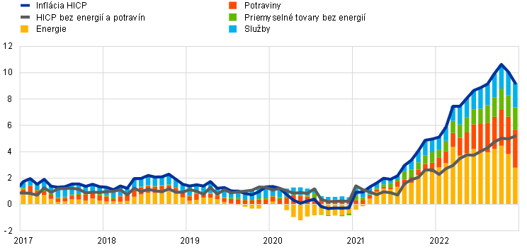 Celková inflácia v eurozóne meraná harmonizovaným indexom spotrebiteľských cien (Harmonised Index of Consumer Prices – HICP) dosiahla v roku 2022 priemernú úroveň 8,4 %, čo predstavuje prudký rast oproti priemeru 2,6 % v roku 2021. Počas roka inflácia prudko stúpala a v neskorších mesiacoch dosahovala vysoké medziročné úrovne okolo 10 %. Najdôležitejšou zložkou zvýšenia celkovej inflácie boli ceny energií, pričom čoraz výraznejšie rástli aj ceny potravín, najmä po invázii Ruska na Ukrajinu vo februári. K inflačným tlakom ďalej prispievali pretrvávajúce obmedzenia na strane ponuky priemyselných tovarov, oživenie dopytu po zmiernení protipandemických obmedzení, najmä v sektore služieb, a oslabenie eura (graf 1.11). Cenové tlaky sa vo všeobecnosti šírili do čoraz väčšieho počtu sektorov, čiastočne v dôsledku vplyvu vysokých nákladov na energie pôsobiaceho v celom hospodárstve. Zároveň sa výrazne zvýšili aj rozdiely v miere inflácie medzi jednotlivými krajinami eurozóny, čo je predovšetkým odrazom rôznej úrovne expozície voči cenovým šokom v oblasti komodít a energií. Väčšina ukazovateľov základnej inflácie zaznamenala v priebehu roka značný nárast. Očakávalo sa, že faktory, ktoré viedli k prudkému zvýšeniu inflácie, ustúpia koncom roka 2022 a inflácia sa v priebehu roka 2023 zmierni.