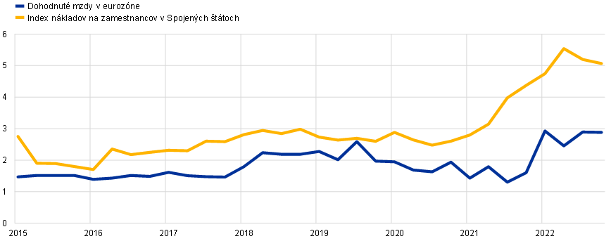 Trh práce v eurozóne zostal v roku 2022 napriek ruskej vojne na Ukrajine celkovo odolný, o čom svedčí aj pokračujúci vysoký počet voľných pracovných miest ku koncu roka. Vývoj na trhu práce a ukazovatele z prieskumov o dopyte po pracovnej sile sa však v druhej polovici roka výrazne spomalili. V boxe 1 sa porovnáva vývoj na trhu práce v Spojených štátoch a eurozóne s cieľom objasniť rozdiely a podobnosti vo faktoroch podporujúcich oživenie po pandémii a vo vyhliadkach vývoja zamestnanosti a miezd.