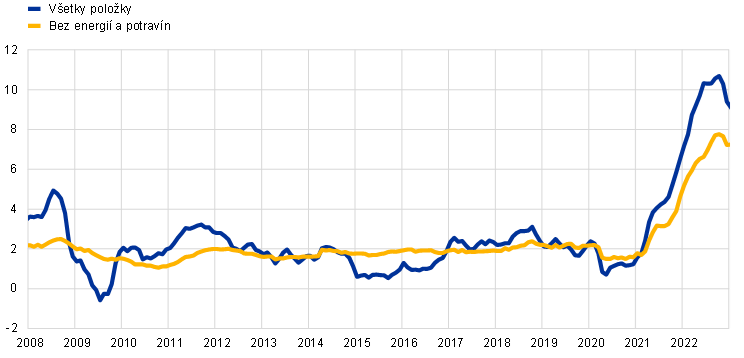 Inflácia v eurozóne vzrástla z 2,6 % v roku 2021 na 8,4 % v roku 2022. Tento nárast bol spôsobený najmä prudkým zvýšením cien energií a potravín vyvolaným vojnou na Ukrajine. Predchádzajúce obmedzenia na strane ponuky a určitý odložený dopyt vyplývajúce z pandémie koronavírusu (COVID‑19) spolu s vysokými vstupnými nákladmi vo výrobe v dôsledku rastu cien energií viedli k zvýšeniu cenových tlakov v mnohých odvetviach hospodárstva. Po silnom prvom polroku, keď najmä sektor služieb ťažil zo zrušenia protipandemických obmedzení, sa hospodársky rast v eurozóne spomalil, a to najmä pre účinky vojny na Ukrajine.