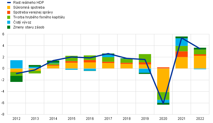 Reálny HDP eurozóny sa v roku 2022 zvýšil o 3,5 %, po náraste o 5,3 % v roku 2021, keď sa ekonomika zotavovala z recesie súvisiacej s pandémiou (graf 1.3). Rast v roku 2022 odrážal najmä výrazný príspevok domáceho dopytu. Ku koncu roka bola produkcia v eurozóne o 2,4 % vyššia ako pred pandémiou, t. j. v porovnaní s posledným štvrťrokom 2019. Vývoj rastu sa v jednotlivých krajinách značne líšil, čo bolo odrazom rozdielnych hospodárskych štruktúr, ako aj miery, v akej jednotlivé krajiny ťažili z opätovného otvorenia sektora služieb či ako boli ovplyvnené inváziou Ruska na Ukrajinu. Keď sa výrazný nárast dopytu po službách s intenzívnym osobným kontaktom z prvej polovice roka utlmil, prudko stúpajúce ceny energií začali v celej ekonomike tlačiť na znižovanie spotreby a výroby. Eurozóna pocítila tiež vplyv slabnúceho globálneho dopytu a prísnejšej menovej politiky v mnohých veľkých ekonomikách v prostredí vysokej hospodárskej neistoty a klesajúcej dôvery podnikov aj domácností.