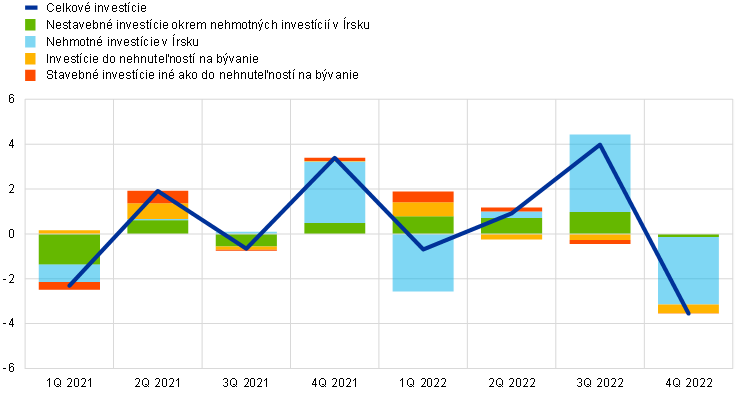 Rast nestavebných investícií, ktorý je ukazovateľom súkromných investícií nesúvisiacich s bývaním, v roku 2022 výrazne kolísal (graf 1.5).[1] Ak sa vylúči výnimočne volatilná zložka nehmotných investícií v Írsku[2], rast nestavebných investícií sa počas roka spomalil. Na začiatku roka mali investície silnú východiskovú pozíciu, pričom ich podporoval vysoký dopyt, značné zisky podnikov a priaznivé podmienky financovania po zrušení protipandemických obmedzení. Ruská vojna na Ukrajine a následná energetická kríza spolu so znížením menovopolitických stimulov však priniesli zvyšujúce sa náklady podnikov na energie a financovanie. Popri spomaľovaní domáceho a globálneho dopytu v prostredí vysokej neistoty sa znížila aj ich investičná motivácia. Z porovnania vyplýva, že nestavebné investície boli na konci roka 2022 výrazne pod úrovňou zaznamenanou v poslednom štvrťroku 2019, keď boli podporené značným rastom nehmotných investícií. Zotavili sa už pred koncom roka 2020, s výnimkou nehmotných investícií v Írsku. Celkovo sa nestavebné investície v roku 2022 zvýšili o 5,2 %.