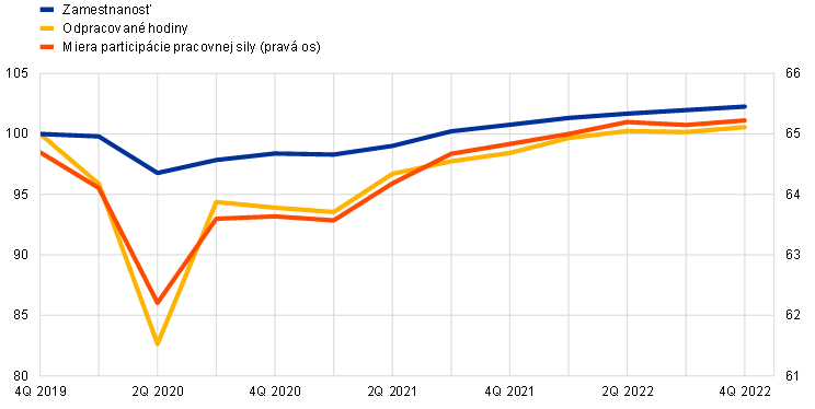 Na trhu práce pokračovalo výrazné oživenie po pandémii súbežne s opätovným zvyšovaním hospodárskej aktivity v eurozóne. Celková zamestnanosť a celkový počet odpracovaných hodín do posledného štvrťroka 2022 prekročili úrovne z posledného štvrťroka 2019 o 2,3 % a 0,6 % (graf 1.6). Miera participácie pracovnej sily vo vekovej skupine 15 – 74 rokov v poslednom štvrťroku 2022 stúpla na úroveň 65,2 %, čo je o 0,5 percentuálneho bodu viac ako v poslednom štvrťroku 2019. V súlade s rastom zamestnanosti ďalej klesala miera nezamestnanosti z už vtedy historicky nízkej úrovne 6,9 % v januári 2022 na 6,7 % ku koncu roka 2022 (graf 1.7). Znížila sa miera využívania programov na zachovanie pracovných miest, ktoré počas krízy zmiernili prepúšťanie, a pracovníci zapojení do týchto programov sa zväčša vrátili k svojmu bežnému pracovnému času.
