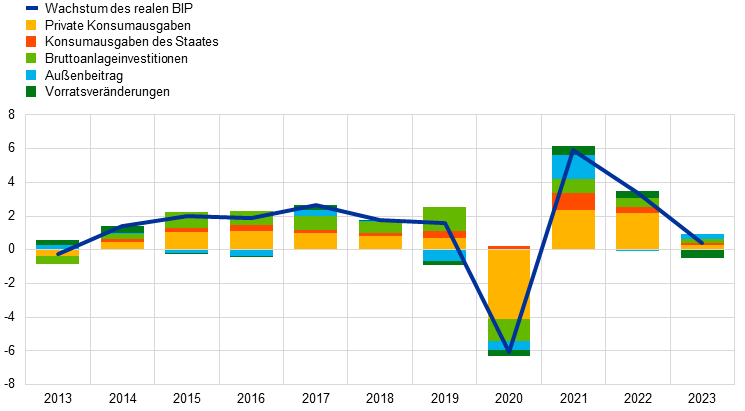 Das reale BIP des Euroraums stieg 2023 um 0,4 %, nachdem es sich im Vorjahr um 3,4 % erhöht hatte (siehe Abbildung 1.3). Dabei leisteten die Binnennachfrage und der Außenhandel positive Wachstumsbeiträge. Von den Vorratsveränderungen gingen indes hemmende Impulse aus. Ende 2023 lag die Wirtschaftsleistung im Euroraum 3,0 % über dem Stand vor der Pandemie (also dem Schlussquartal 2019) bzw. 1,4 % über dem Stand des ersten Quartals 2022, als Russland die Ukraine überfiel. Die Wachstumsverlangsamung 2023 war zum Großteil auf die wirtschaftlichen Folgen des Krieges zurückzuführen, wobei die Auswirkungen auf die einzelnen Länder in Abhängigkeit ihrer jeweiligen Wirtschaftsstrukturen unterschiedlich waren. So wurde die Industrie insbesondere von der geldpolitischen Straffung, hohen Energiepreisen und einer sich abschwächenden weltweiten Nachfrage getroffen. Im Gegensatz dazu konnte sich der Dienstleistungssektor relativ gut behaupten, da er noch von den Effekten des Wiederhochfahrens der Wirtschaft nach der Pandemie profitierte. Allerdings weitete sich die Wachstumsschwäche gegen Ende des Berichtsjahrs aus. Zurückzuführen war dies auf den Einfluss der höheren Zinssätze, der in den einzelnen Wirtschaftssektoren zunehmend spürbar war, sowie auf die Übertragungseffekte von der schwachen Industrie auf den Dienstleistungssektor.