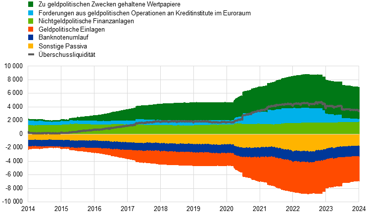 Parallel dazu trieben wir die Normalisierung der Eurosystem-Bilanz voran, damit sichergestellt ist, dass diese auch in Zukunft mit unserem allgemeinen Kurs im Einklang steht. Die Bilanz des Eurosystems schrumpfte 2023 um mehr als 1 Billion €. Ein großer Teil dieses Rückgangs war auf Fälligkeit und vorzeitige Rückzahlungen von im Rahmen unserer gezielten längerfristigen Refinanzierungsgeschäfte aufgenommenen Mitteln zurückzuführen. Darüber hinaus stellten wir im Jahresverlauf die Wiederanlagen im Rahmen unseres Programms zum Ankauf von Vermögenswerten ein. Im Dezember kündigten wir an, die Wiederanlagen im Zuge des Pandemie-Notfallankaufprogramms auslaufen zu lassen.