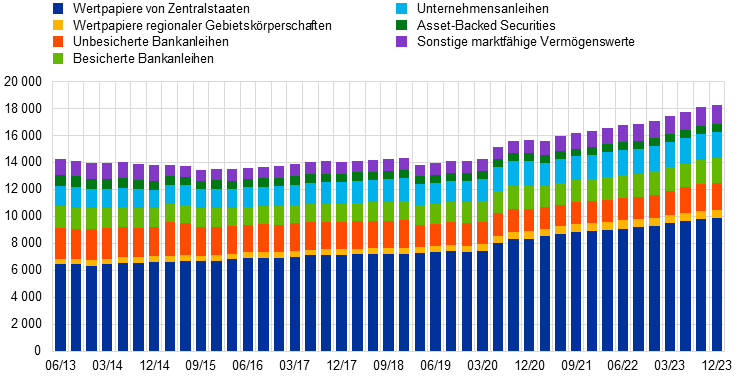 Die EZB hob ihre Leitzinsen 2023 um weitere 200 Basispunkte an. Der Einlagesatz erhöhte sich dadurch auf 4 %. Die geldpolitische Straffung schlug stark auf die Wirtschaft durch. | Die harte Kernkapitalquote der Banken im Euroraum lag im dritten Quartal 2023 bei 15,6 %. Damit lag sie nahe am höchsten Stand seit Beginn der europäischen Bankenaufsicht, was mit der höheren Rentabilität und dem Abbau von Risiken in den Bankenportfolios im Zusammenhang stand. |