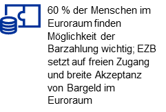 Außerdem haben wir 2023 die Vorbereitungsphase für das Projekt zum digitalen Euro eingeläutet. Dieser Projektabschnitt startete im November im Anschluss an die erfolgreiche zweijährige Untersuchungsphase. Nun sollen die Voraussetzungen für die mögliche Ausgabe eines digitalen Euro geschaffen werden. Ein digitaler Euro würde das Euro-Bargeld ergänzen, nicht ersetzen. Bargeld ist nach wie vor das von den Bürgerinnen und Bürgern im Euroraum am häufigsten genutzte Zahlungsmittel. Für eine große Mehrheit ist es wichtig, die Möglichkeit zur Barzahlung zu haben.