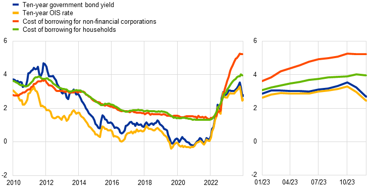 The ECB raised its key interest rates by a further 200 basis points over 2023, bringing the deposit facility rate to 4%. The tightening of monetary policy was transmitted forcefully to the economy. | The Common Equity Tier 1 ratio of euro area banks stood at 15.6% in the third quarter. This was close to its highest level since the start of European banking supervision and reflected the higher profitability and de-risking of bank portfolios. |