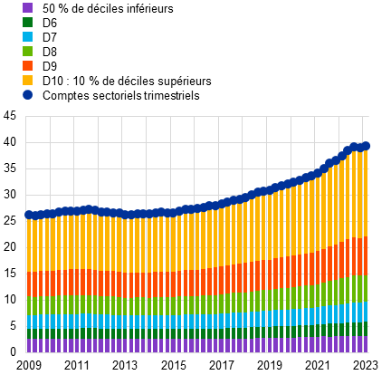 Les principales différences conceptuelles entre le déflateur du PIB et l’IPCHX résultent du fait que l’IPCHX est fondé sur les prix de vente des biens et services consommés par les ménages dans les catégories concernées, qu’ils soient produits au niveau national ou importés, tandis que le déflateur du PIB prend en compte les prix de la valeur ajoutée de tous les produits fabriqués par l’économie nationale et n’inclut pas la contribution de la consommation intermédiaire aux prix finaux. Cf. l’encadré intitulé « Comment les profits unitaires ont-ils contribué à la récente accentuation des tensions sur les prix domestiques de la zone euro ? », Bulletin économique, no 4, BCE, 2023.