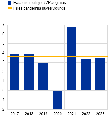 2023 m. pasaulio ekonomika ir toliau augo nuosaikiai, o palyginti su 2022 m., jos plėtra iš esmės nepakito – 3,5 % (žr. 1.1 pav.)[1]. Nors, palyginti su ilgalaikiu vidurkiu, augimas buvo prislopęs, jis buvo spartesnis, nei tikėtasi metų pradžioje, nes jį palaikė stiprios darbo rinkos ir didžiulė paslaugų paklausa, nepaisant toliau griežtinamos pinigų politikos[2]. Pasaulio ekonomikos augimą daugiausia lėmė besiformuojančios rinkos ekonomikų ir JAV ekonomikos aktyvumas, o daugumoje kitų išsivysčiusios ekonomikos šalių griežtos finansavimo sąlygos ir užsitęsęs geopolitinių veiksnių poveikis energijos kainoms darė didesnį slopinantį poveikį paklausai. Dėl didelės vidaus paklausos ir stiprios darbo rinkos JAV ekonomika buvo atsparesnė, negu tikėtasi. Metų pradžioje kilusi sumaištis JAV finansų sektoriuje neturėjo reikšmingo makroekonominio poveikio. Kinijoje, kurioje 2022 m. gruodžio mėn. buvo sušvelnintos itin griežtos su pandemija susijusios priemonės, metų pradžioje prasidėjusį ekonomikos atsigavimą nutraukė atsinaujinęs būsto sektoriaus nuosmukis, taip pat maža vidaus ir išorės paklausa. Nepaisant to, Kinijos ekonomika pasiekė vyriausybės nustatytą augimo tikslą – apie 5 %.