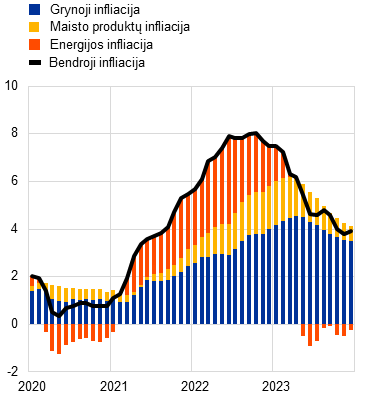 2023 m. gruodžio mėn. bendroji infliacija pagal suderintą vartotojų kainų indeksą (SVKI) euro zonoje sudarė 2,9 %, t. y. sumažėjo 6,3 procentinio punkto nuo 2022 m. gruodžio mėn. buvusio lygio. Visus metus ji stabiliai mažėjo, o per metus sumažėjo ir bazinė infliacija. Lapkričio mėn. bendroji infliacija sudarė 2,4 %, t. y. laikinai buvo žemiausio lygio per daugiau nei dvejus metus (reikšmingai sumažėjo nuo 2022 m. spalio mėn. pasiekto aukščiausio 10,6 % lygio) (žr. 1.8 pav.). Tačiau infliacija vėl šiek tiek padidėjo dėl prieš metus taikytų su energetika susijusių fiskalinių priemonių mažinančio poveikio kainų lygiui. 2023 m. antrąjį pusmetį, palyginti su 2022 m. tuo pačiu laikotarpiu, mažėjo visos pagrindinės infliacijos sudedamosios dalys, ir tai rodė nykstantį ankstesnių kainų sukrėtimų poveikį ir mažesnę paklausą griežtesnės pinigų politikos sąlygomis. Tačiau infliacijos lygis (išskyrus energijos kainas), palyginti su ankstesnių metų atitinkamu laikotarpiu, vis dar buvo gerokai didesnis už ilgesnio laikotarpio vidurkius, o į metinį perskaičiuotas ketvirtinis pokytis jau gerokai priartėjo prie šių rodiklių. Prekių kainų raida mažėjo sparčiau negu paslaugų, nes, mažėjant tiekimo trikdžiams ir žaliavų kainoms, labai sumažėjo ir spaudimas. Iki metų vidurio paslaugų kainos kilo dėl vis dar didelės po pandemijos paklausos, didėjančių darbo sąnaudų ir laikinų veiksnių, susijusių su fiskalinėmis priemonėmis. Sumažėjus energijos ir maisto produktų kainų kilimui, gerokai sumažėjo ir infliacijos lygio skirtumai euro zonos šalyse.