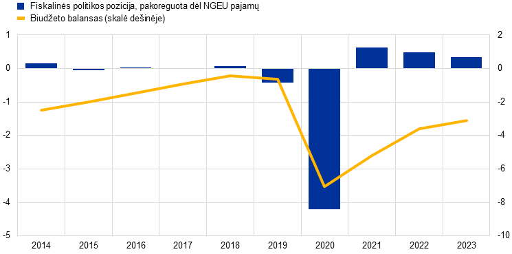 Pastaba: fiskalinės politikos pozicija nuo 2021 m. koreguojama pajamų atžvilgiu, atmetant dotacijas pagal NGEU Ekonomikos gaivinimo ir atsparumo didinimo priemonę, nes šios pajamos neturi makroekonominio griežtinimo poveikio.