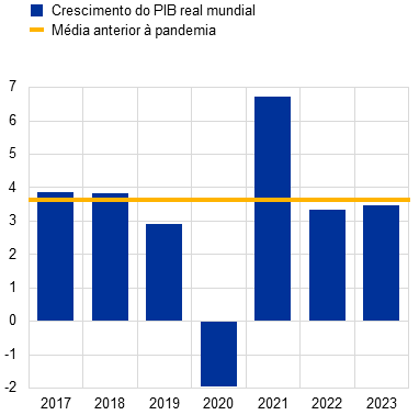 Notas: “PIB mundial” exclui a área do euro. A média anterior à pandemia refere‑se ao período de 2012 a 2019. Os valores para 2023 são estimativas baseadas nos dados disponíveis e nas projeções macroeconómicas de março de 2024 elaboradas por especialistas do BCE.