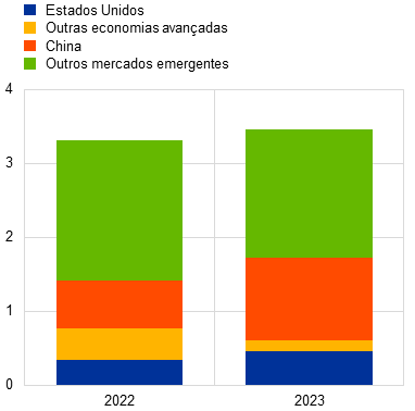 De acordo com as projeções macroeconómicas de dezembro de 2022 elaboradas por especialistas do Eurosistema, o crescimento mundial deveria abrandar para 2,6% em 2023.