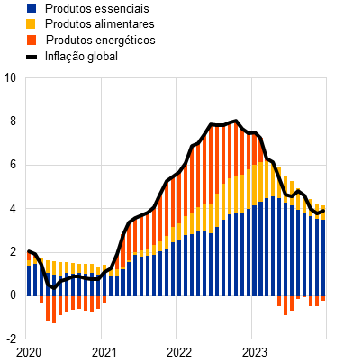 Na área do euro, o crescimento económico enfraqueceu em 2023. O setor industrial foi particularmente afetado por condições de financiamento mais restritivas, elevados custos dos fatores de produção e uma procura mundial fraca, sendo que o setor dos serviços foi ainda inicialmente apoiado pelos efeitos persistentes da reabertura da economia após a pandemia. Embora o aumento da restritividade das taxas de juro do BCE tenha sido transmitido de forma vigorosa à atividade económica, o mercado de trabalho manteve‑se bastante resiliente. Os governos da área do euro continuaram a eliminar gradualmente as medidas de apoio adotadas em resposta aos choques provocados pela pandemia, pelos preços dos produtos energéticos e pela inflação, invertendo parte da anterior redução da restritividade orçamental. A inflação global diminuiu acentuadamente na área do euro, ajudada, em especial, pela descida da inflação dos preços dos produtos energéticos para território negativo, à medida que as fortes subidas dos preços dos produtos energéticos em 2022 se desvaneciam. A inflação subjacente começou também a moderar‑se, apoiando um processo desinflacionista geral e refletindo a atenuação do impacto de choques anteriores e os efeitos crescentes da maior restritividade da política monetária. Contudo, as pressões internas sobre os preços substituíram as pressões externas como principais fatores impulsionadores da inflação, enquanto o mercado de trabalho apoiou a evolução robusta dos salários nominais, tendo os trabalhadores procurado compensação por anteriores perdas do poder de compra causadas pela inflação.