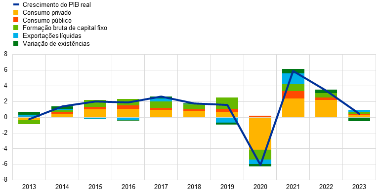 O PIB real da área do euro aumentou 0,4% em 2023, tendo crescido 3,4% em 2022 (gráfico 1.3). O crescimento refletiu contributos positivos da procura interna e do comércio líquido. A variação de existências exerceu um impacto atenuante. No final do ano, o produto na área do euro situava‑se 3,0% acima do nível registado antes da pandemia (no último trimestre de 2019) e 1,4% acima do seu nível no primeiro trimestre de 2022, quando a Rússia invadiu a Ucrânia. O abrandamento do crescimento em 2023 deveu‑se, em grande medida, às repercussões económicas da guerra, que tiveram efeitos distintos consoante os países, refletindo as diferentes estruturas económicas. Embora o setor industrial tenha sido particularmente afetado pela política monetária mais restritiva, pelos preços elevados dos produtos energéticos e pelo enfraquecimento da procura mundial, o setor dos serviços resistiu relativamente bem, beneficiando ainda dos efeitos da reabertura da economia após a pandemia. Todavia, perto do final do ano, a dinâmica frágil do crescimento generalizou‑se, à medida que o impacto das taxas de juro mais elevadas se estendeu aos diversos setores, aliado a efeitos de repercussão do setor industrial fraco sobre os serviços.