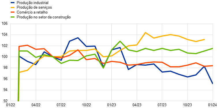 Notas: O comércio a retalho é apresentado em termos reais. As últimas observações referem‑se a dezembro de 2023 para a produção de serviços e, nos restantes casos, a janeiro de 2024.