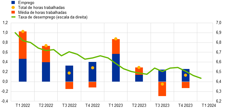 Nota: As últimas observações referem‑se a janeiro de 2024 para a taxa de desemprego e ao quarto trimestre de 2023 para o emprego e as horas trabalhadas.