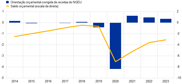 Nota: A medida da orientação orçamental é corrigida desde 2021 do lado da receita através da exclusão das subvenções do Mecanismo de Recuperação e Resiliência do NGEU, dado que essas receitas não produzem efeitos macroeconómicos de aumento de restritividade.
