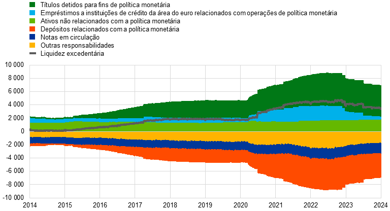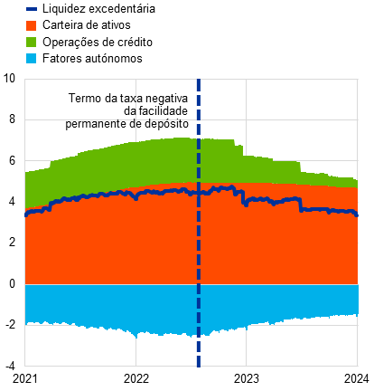 Paralelamente, prosseguimos com a normalização do balanço do Eurosistema, a fim de assegurar que permanecia coerente com a nossa orientação global. O balanço diminuiu mais de 1 bilião de euros em 2023, sendo grande parte desta descida devida a vencimentos e reembolsos antecipados no âmbito das nossas operações de refinanciamento de prazo alargado direcionadas. Concluímos também reinvestimentos ao abrigo do nosso programa de compra de ativos, à medida que o ano avançava. E, em dezembro, anunciámos a eliminação gradual dos reinvestimentos no contexto do programa de compra de ativos devido a emergência pandémica.