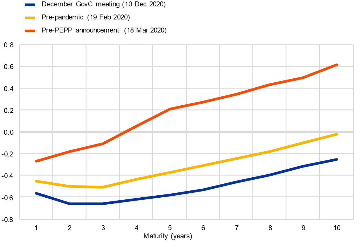 The other was the lasting success of our measures, and the PEPP in particular, in delivering a degree of monetary accommodation that was historic on various levels. The euro area GDP-weighted sovereign yield curve was firmly in negative territory and well below pre-crisis levels (Chart 2). The dispersion across euro area long-term sovereign yields had reached a new low for the period since the global financial crisis. And bank lending rates were at, or close to, historical lows.