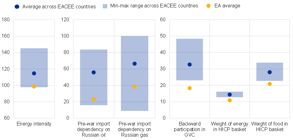 Notes: Averages across EACEE countries are unweighted averages. Euro area figures for energy intensity and import dependency are calculated using country-weights based on nominal GDP. Energy intensity measures the energy needs of an economy and is calculated as units of energy per unit of GDP. Data on energy intensity refer to 2021. Russian oil refers to Russian oil and petroleum products. Russian gas refers to Russian natural gas. Data on import dependency on Russian oil and gas refer to 2020. Backward GVC participation is the foreign value added embedded in domestic exports. Data on backward GVC participation refer to 2020. Data on weights in the HICP basket refer to 2022.