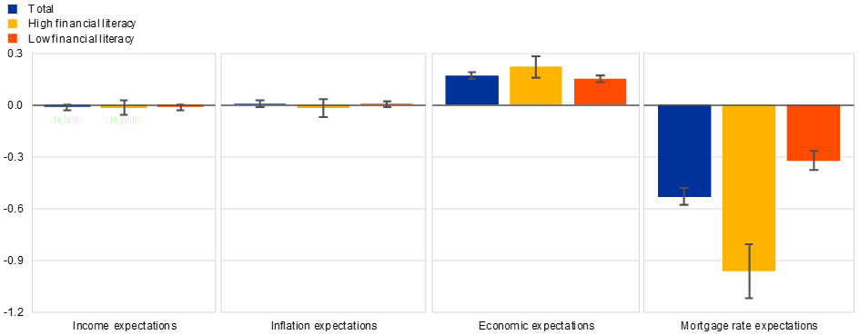 Chart 4 shows that expectations relating to mortgages and savings are by far the highest contributing factor to whether a respondent thinks it is a good time to borrow or save. However, the effect on the total adjustment is mainly driven by the strong response of consumers with a high level of financial literacy, for which the link between their adjusted interest rate expectations (after the tightening) and their responses about whether it is a good time to borrow and save is much stronger. Other expectations have much less of an effect.