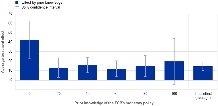 Notes: The figure shows the breakdown of average treatment effects (ATE) for the total population and sub-groups with different levels of prior knowledge of the ECB’s monetary policy, notably the treatment group relative to the control group. ATE estimates, with regression adjustment, include controls for individual demographics such as age, gender, origin and education, for individual inflation and economic growth perceptions, and for prior knowledge.