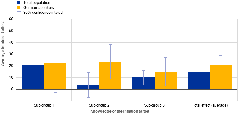 Notes: The figure shows the breakdown of average treatment effects (ATE) for the total population (blue bars) and the German population (yellow bars), notably the treatment group relative to the control group by knowledge of the ECB’s inflation target. ATE estimates, with regression adjustment, include controls for individual demographics such as age, gender, origin and education, and for individual perceptions of inflation and economic growth.