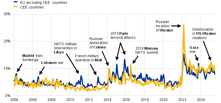 Notes: The geopolitical risk indicator is constructed following the methodology of Caldara and Iacoviello (2022). Using a dictionary of keywords similar to those used in the original study, an automated text search method is applied to a selection of leading domestic newspapers and major news agencies from EU countries, retrieved via Factiva. The indicator is computed monthly as the share of articles referencing adverse geopolitical developments relative to the total number of articles published. This approach adapts the original framework to a European context, providing a localised measure of geopolitical risk as reflected in domestic media coverage.