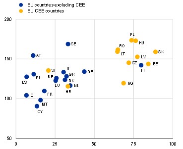 CEE countries were particularly affected, in part due to their reliance on energy-intensive production, the high share of food and energy in their household spending, their economic openness, their integration into global supply chains and their pre-war trade and financial links with Russia. Austria, Finland and Sweden also displayed elevated geopolitical risk.