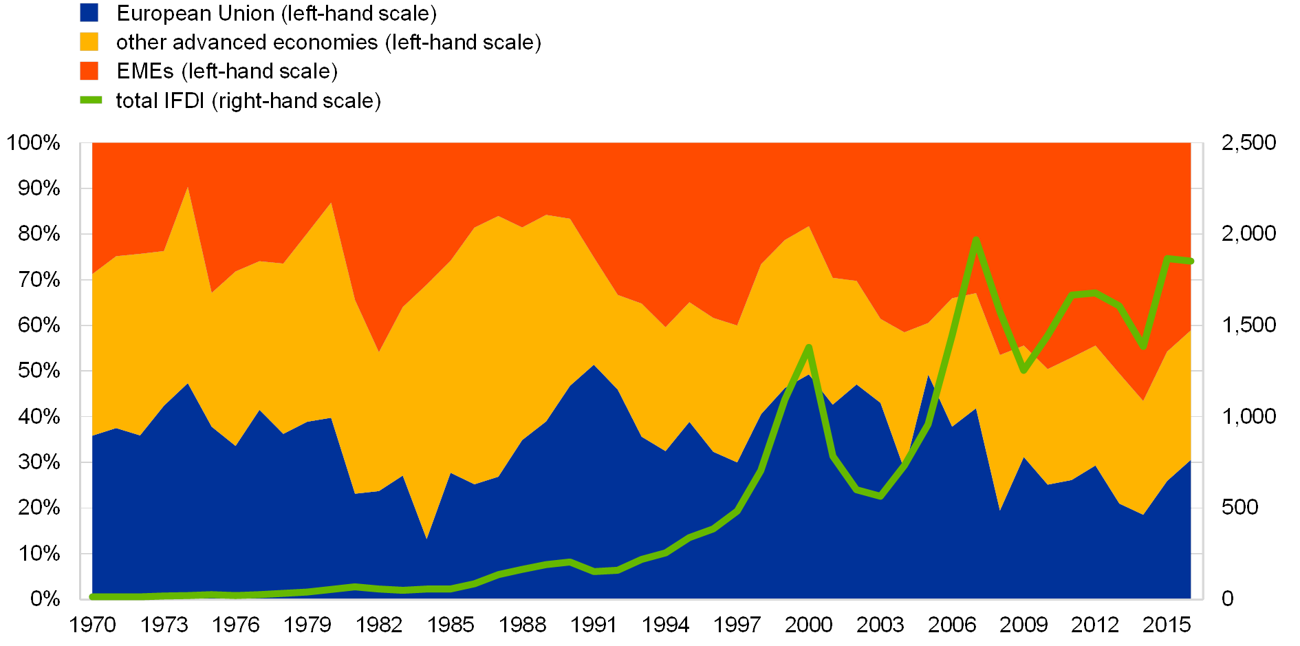 Over the last two decades the global map of inward and outward FDI has changed significantly. FDI has traditionally originated from advanced economies, which were also the main destination (see Chart 1). Since the early 2000s, the importance of EMEs as a destination for FDI has gradually increased. In 2013, for the first time, EMEs attracted more than 50% of global IFDI.[5]