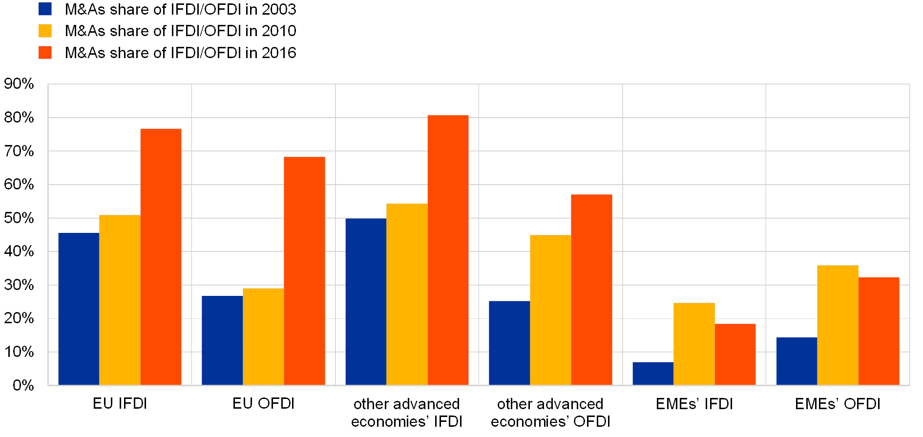 In the EU and other advanced economies, M&As play a prominent role in total IFDI flows. Between 2003 and 2016, an increasing share of IFDI in the EU and other advanced economies was accounted for by M&As.[7] As shown in Chart 3, in both country groups M&As made up around 80% of total IFDI flows in 2016. Although M&As have also increased in importance in EMEs, IFDI in those countries is still dominated by GIs. In 2016 GIs accounted for around 80% of IFDI into EMEs. In the case of OFDI, a similar trend is observed. For the EU and other advanced economies, M&As had become the preferred mode of outward investment by 2016, while for EMEs GIs remained predominant. At the global level, in the period 2003‑2016 EMEs provided the destination for 62.7% of total GI and 19.3% of M&A investment. In terms of OFDI, the EU and other advanced economies accounted for 72% of GI and 82.4% of M&A investment.