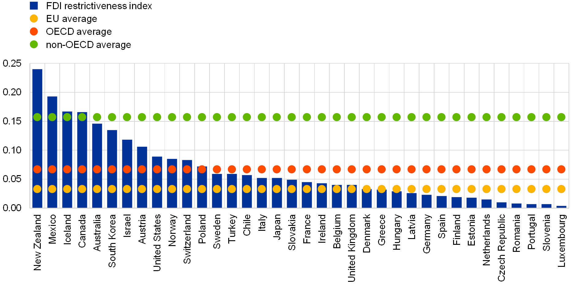 Notes: The OECD’s FDI Regulatory Restrictiveness Index measures regulatory restrictions on foreign direct investment across 22 economic sectors. It gauges the restrictiveness of a country’s FDI rules by focusing on four main types of restriction on FDI: (i) foreign equity limitations; (ii) discriminatory screening or approval mechanisms; (iii) restrictions on the employment of foreigners as key personnel; and (iv) other operational restrictions, e.g. restrictions on branching and capital repatriation or land ownership by foreign‑owned enterprises.