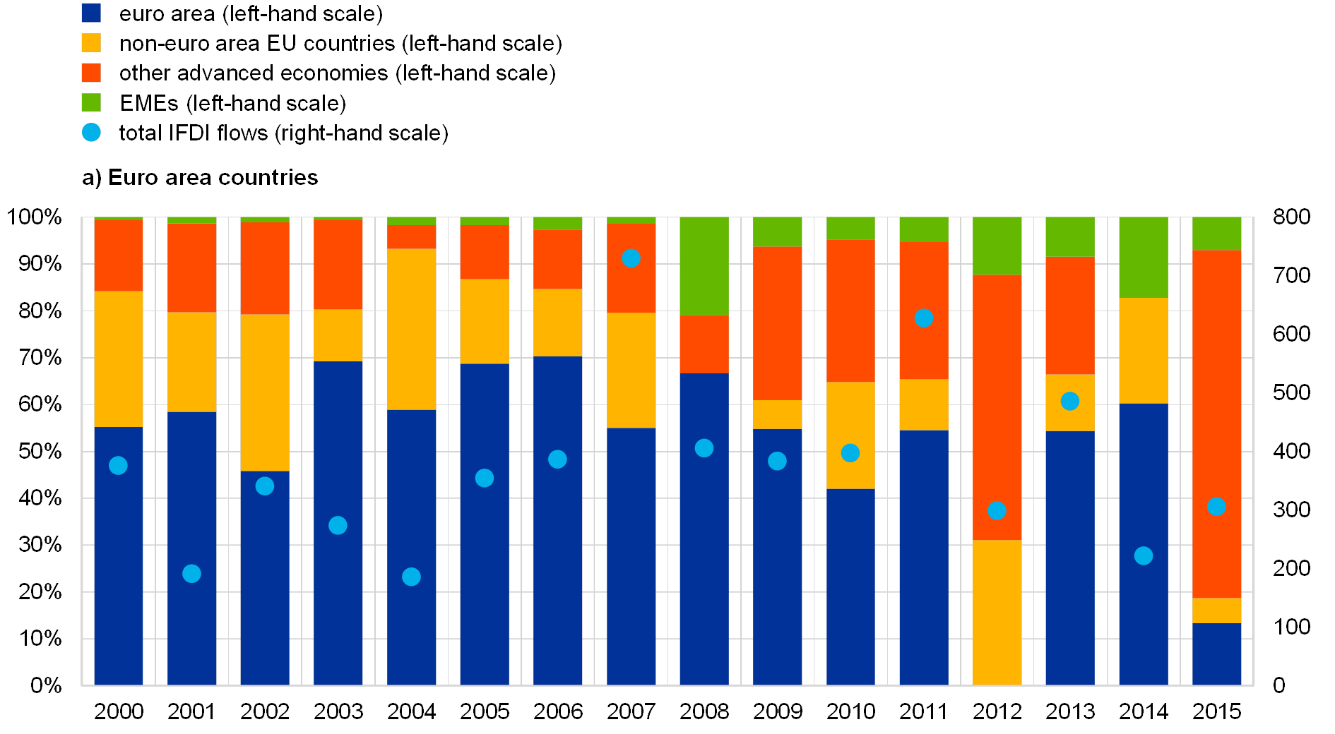(left-hand scale: IFDI into the euro area by origin, percentages; right-hand scale: total IFDI into the euro area, USD billions)