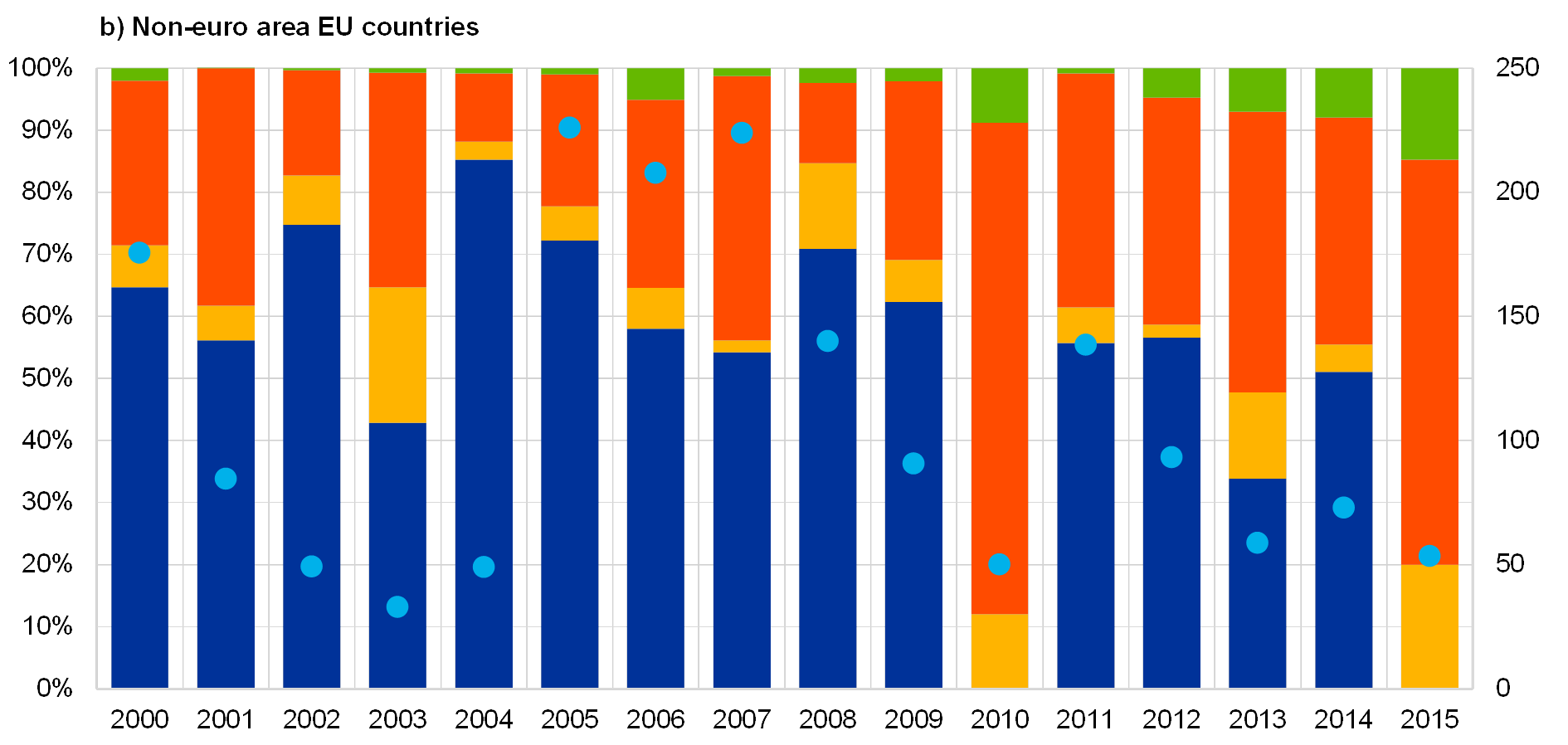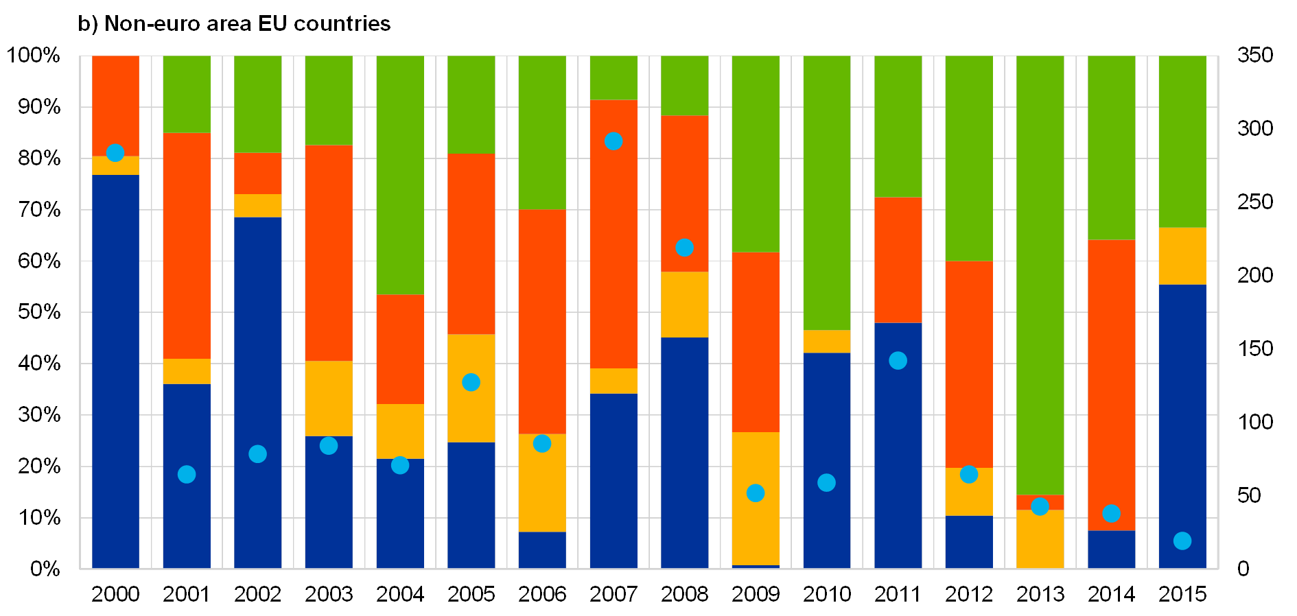 (left-hand scale: non-euro area EU countries’ OFDI by destination, percentages; right-hand scale: total non-euro area EU OFDI, USD billions)