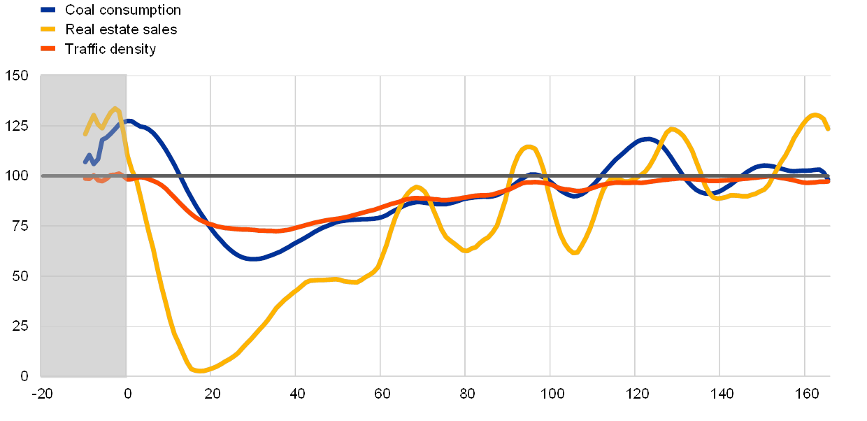 The rapid intensification of the COVID-19 outbreak in China broadly coincided with the start of the Lunar New Year holiday. The Lunar New Year is a seven-day national public holiday which starts between late January and mid-February and for which virtually all factories close down for a prolonged period of time. During this period, migrant workers traditionally return home, giving rise to a peak travel season which involves several hundred million passengers travelling across China every year. Towards the end of January 2020, the Chinese economy powered down, as can be seen, for instance, by the coal consumption of major electricity producers (see Chart 2). The extent of the decline in coal consumption in January 2020 was not unusual compared with that of previous Lunar New Year holidays. However, owing to the COVID-19 outbreak, the public holiday was extended and the resumption of business activity was considerably delayed. A comparison of a number of high-frequency indicators of economic activity with their corresponding levels the previous year shows that it took more than three months for several of these indicators, such as coal consumption, real estate sales and traffic density, to return to their 2019 levels (see Chart 3).
