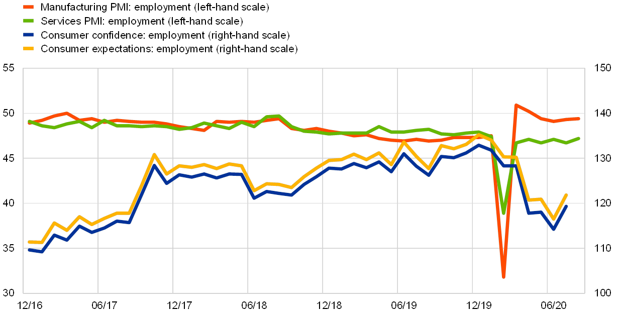 Note: The latest observations are for August 2020 for the PMIs and July 2020 for the consumer surveys.