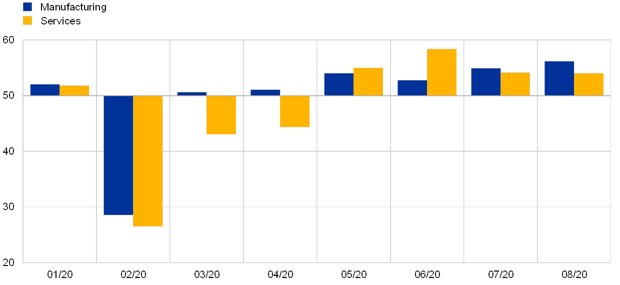 Survey data point to an uneven recovery, with manufacturing rebounding earlier than the services sector. While the elevated uncertainty necessitates some caution in interpreting PMIs, the manufacturing PMI returned to expansionary territory as early as March, whereas the services PMI continued to signal a softening of activity until May, when it rose above the neutral threshold (see Chart 10). Although the services PMI reached 58.4 in July, its levels in the period from February to April imply that the contraction in the services sector was larger than in manufacturing. Overall, the manufacturing and construction sectors returned to almost full capacity in the course of May. On the other hand, services sectors, in particular those associated with close physical interaction such as tourism, business travel, and cultural and sporting events, have tended to remain well below pre-outbreak capacity, with activity ranging between 20% and 80% of normal levels.